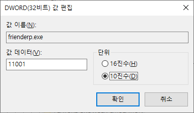 추가한 DWORD값에 이름을 pb115.exe 와 frienderp.exe 로 지정합니다.